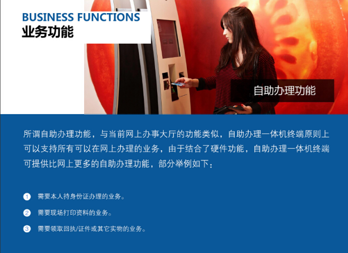 智慧政务系统以整合“政务信息化”为基础,通过自助办理体机终端,延伸“政府信息化”的服务内容和覆盖范围。自助办理体机终端提供部分/全部“政务信息化”功能,结合自助办理体机终端的硬件(比如扫描仪、高拍仪、身份证读卡器、打印机、二维码扫描仪、智能储物柜等),为群众提供身份认证、资料采集、资料/回执打印、自助取件等服务。