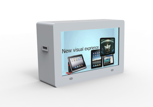 透明展示柜,应用于智慧营业厅,展示贵金属,提升展示物的质感。同时在展览物品的同时可播放广告。